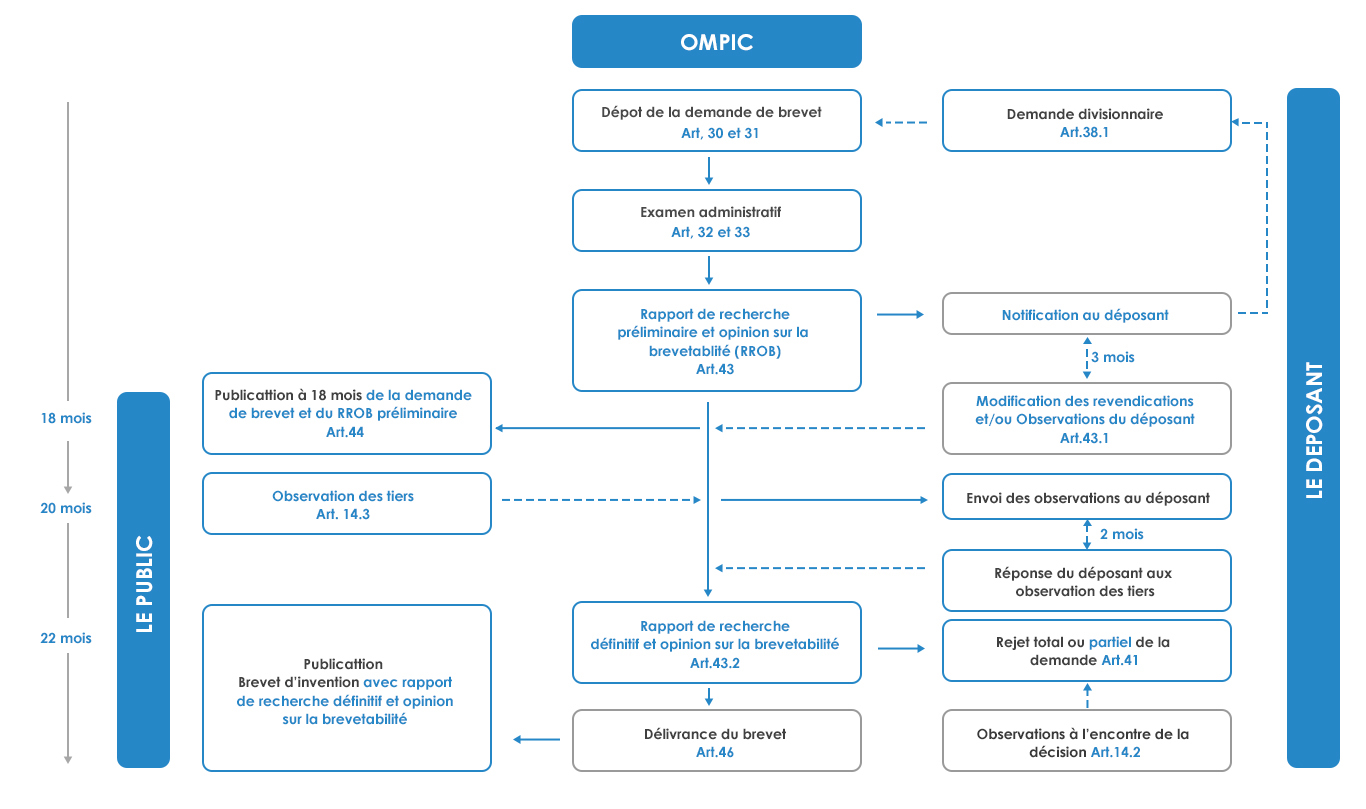 Après l’expiration d’un délai de 18 mois à compter de la date de dépôt, et si votre demande de brevet d’invention n’a pas été retirée ou rejetée suite aux motifs de rejets cités dans l’article 41, celle ci est publiée . Si le rapport de recherche préliminaire est établi, il est publié avec, sinon ils sont publiés séparément.