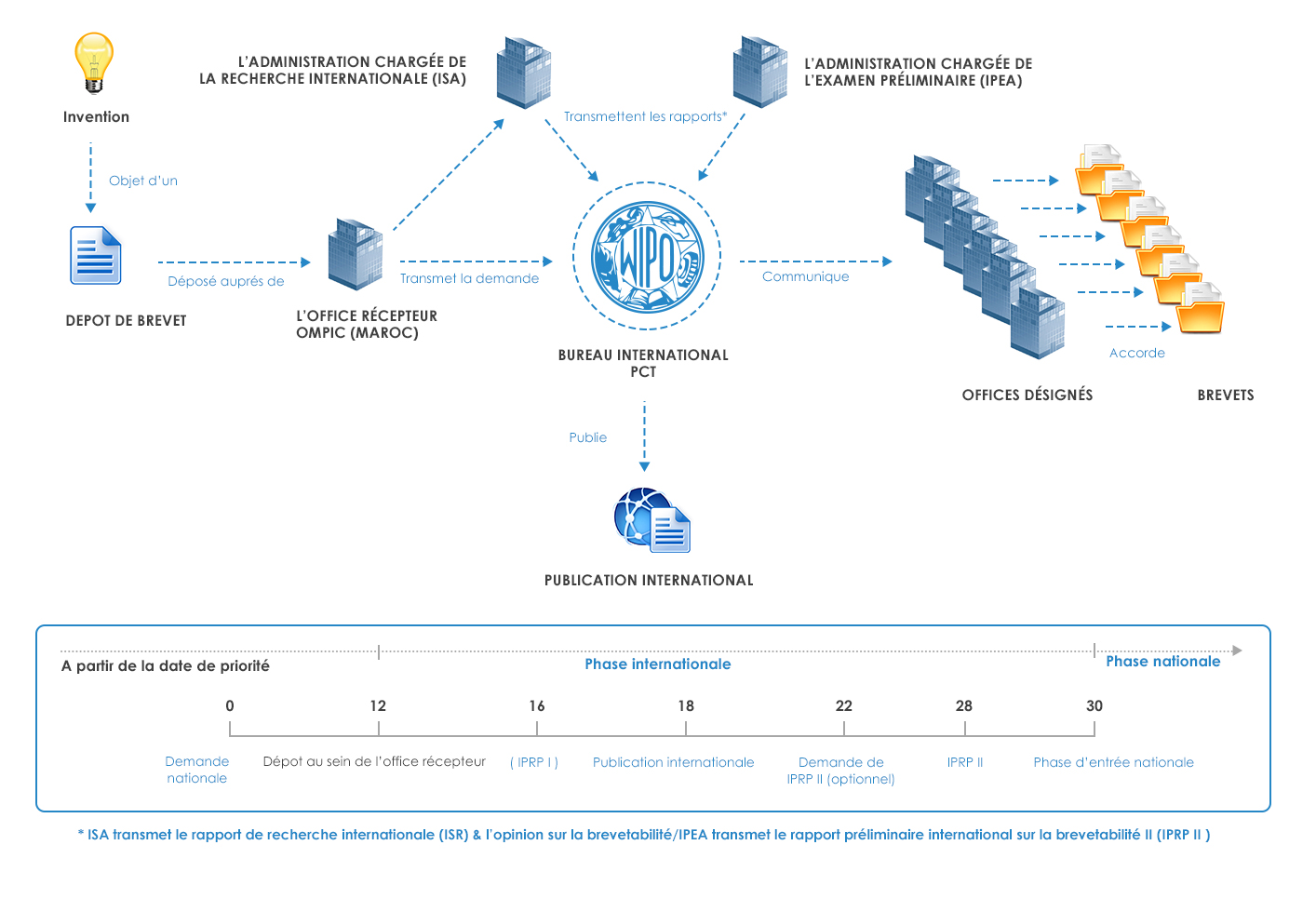 - Auprès de l'Organisation Mondiale de la Propriété Intellectuelle (OMPI) pour bénéficier de l'enregistrement dans tous les pays adhérents au Patent Cooperation Treaty (traité de coopération en matière de brevet), qui regroupe plus de 145pays dont le Maroc.